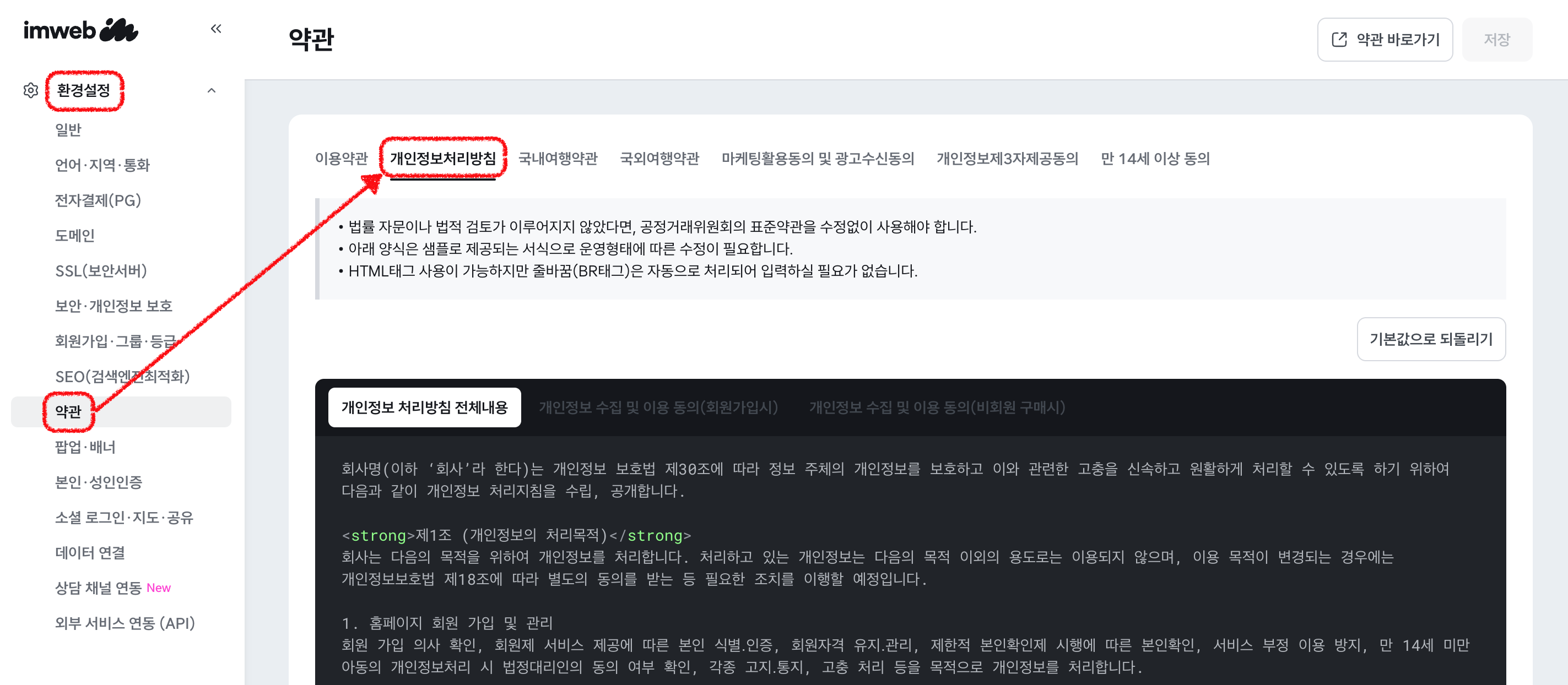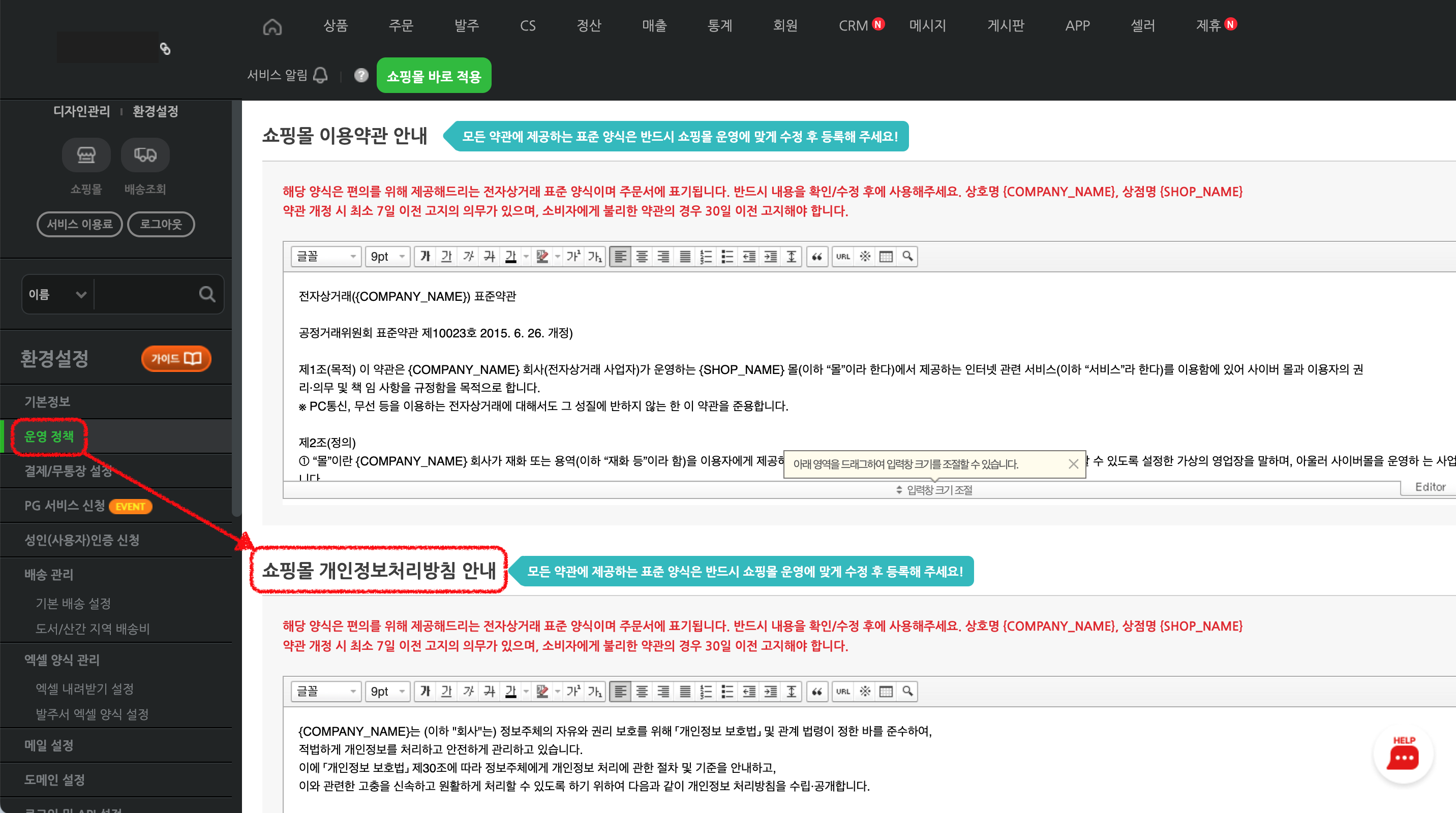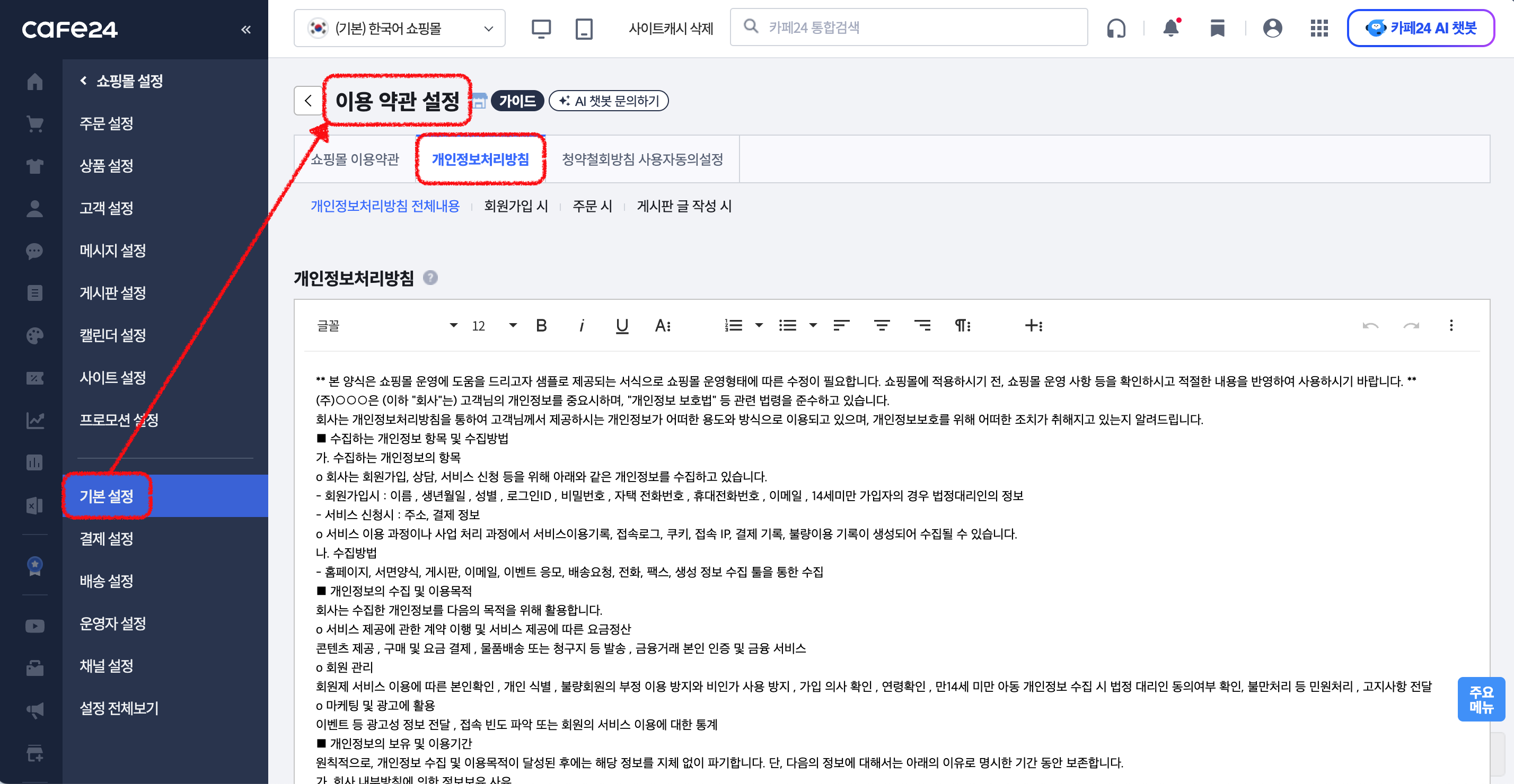 아래 가이드에 따라 우리 쇼핑몰의 개인정보 처리방침을 수정하세요.