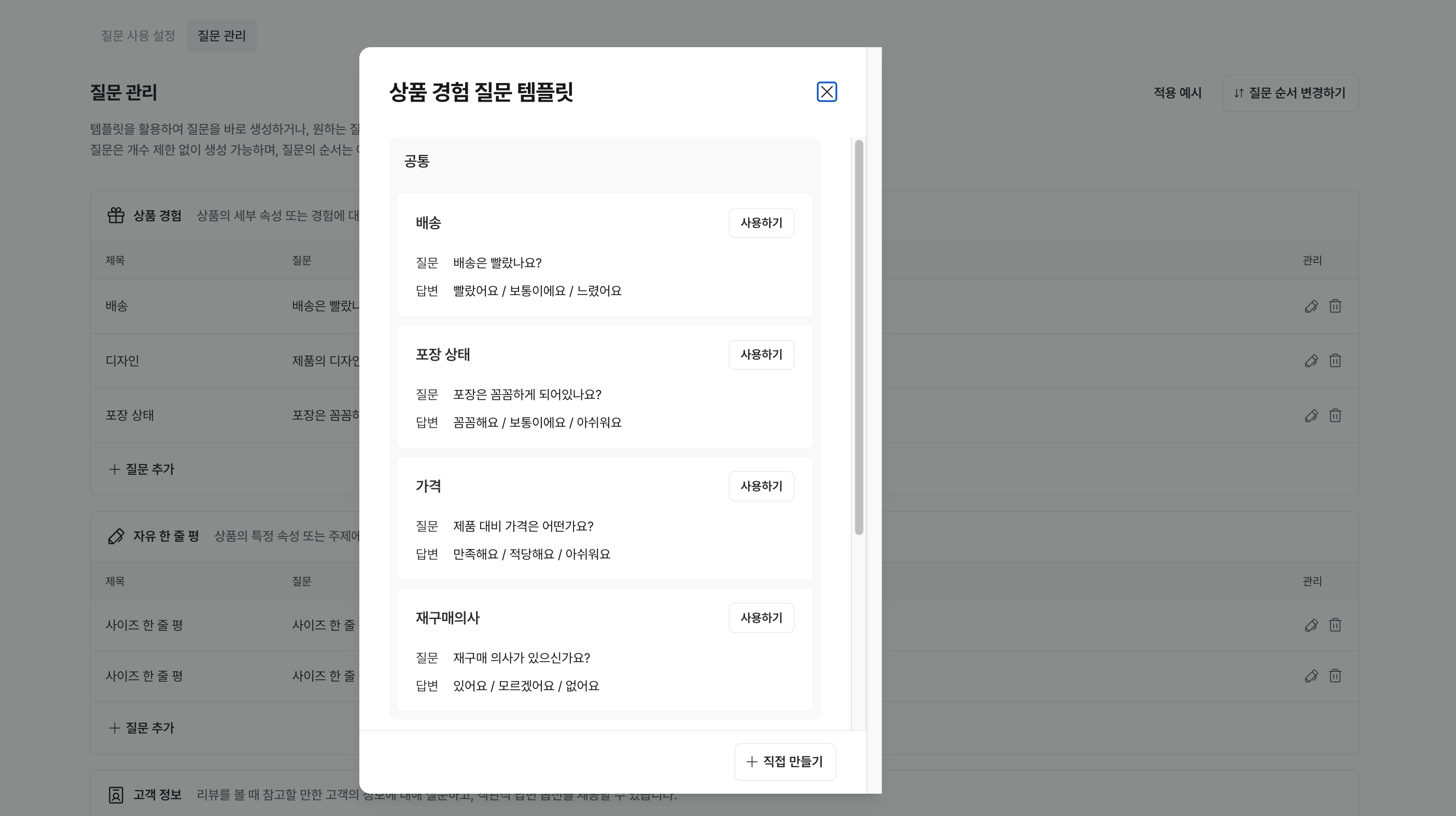 상품 특성에 맞게 설정한 질문을 통해 상품과 고객에 대해 더욱 유용하고 세부적인 정보를 수집합니다.