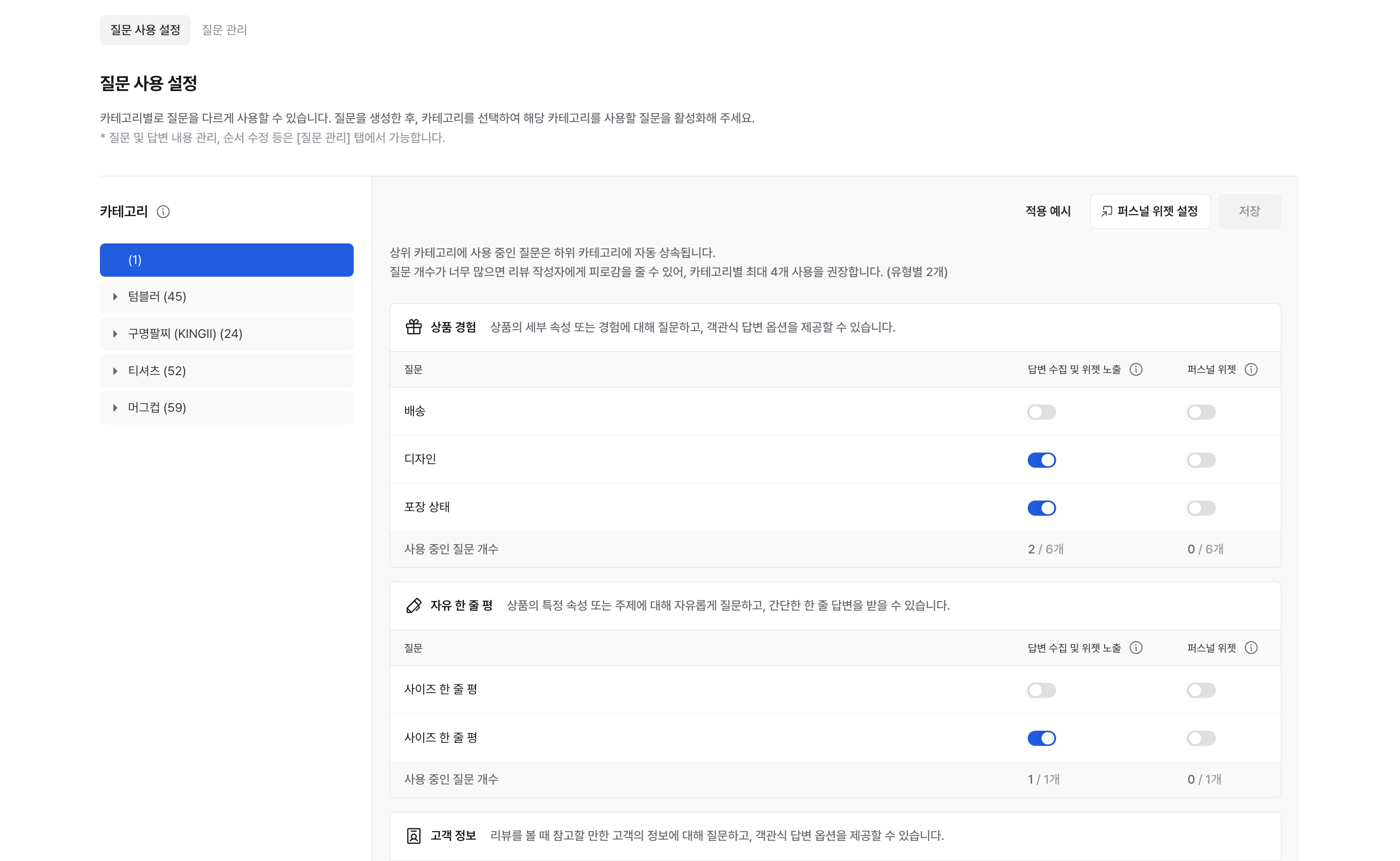 카테고리별로 질문을 다르게 사용할 수 있습니다.