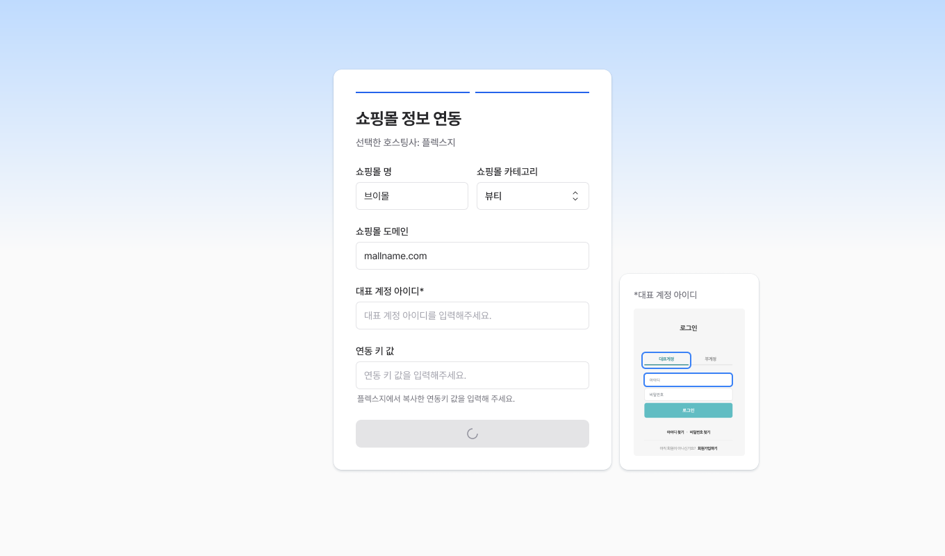 쇼핑몰 기본 정보와 '대표 계정 아이디', '연동 키 값'을 입력합니다.