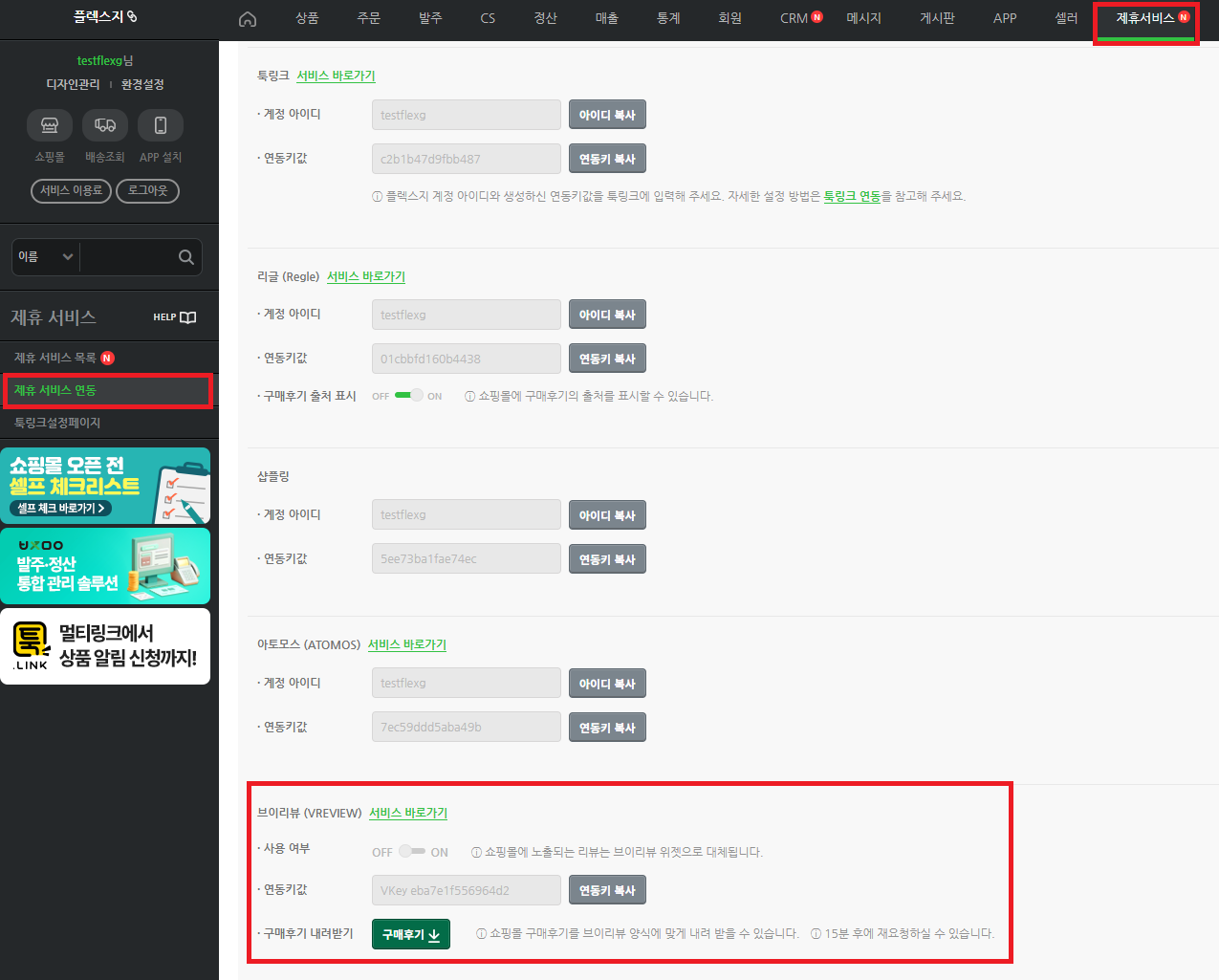 연동 키 값을 복사 후 입력하세요.플렉스지 쇼핑몰 관리자 페이지 → [제휴 서비스] → [제휴 서비스 연동] → [브이리뷰 연동 키 복사]