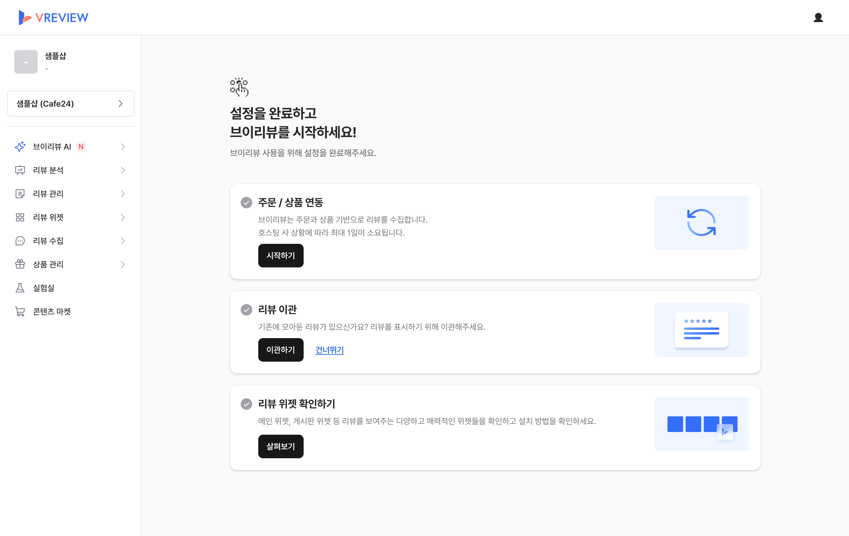 쇼핑몰에서 필요한 정보를 불러오고 적절한 위치에 브이리뷰 위젯을 설치합니다. 온보딩 절차가 마무리되면 결제 카드 등록 후 브이리뷰 사용을 시작할 수 있습니다.