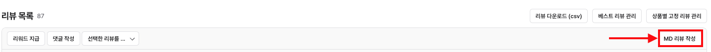 리뷰 관리 > 전체 리뷰 > MD 리뷰 작성을 클릭합니다.