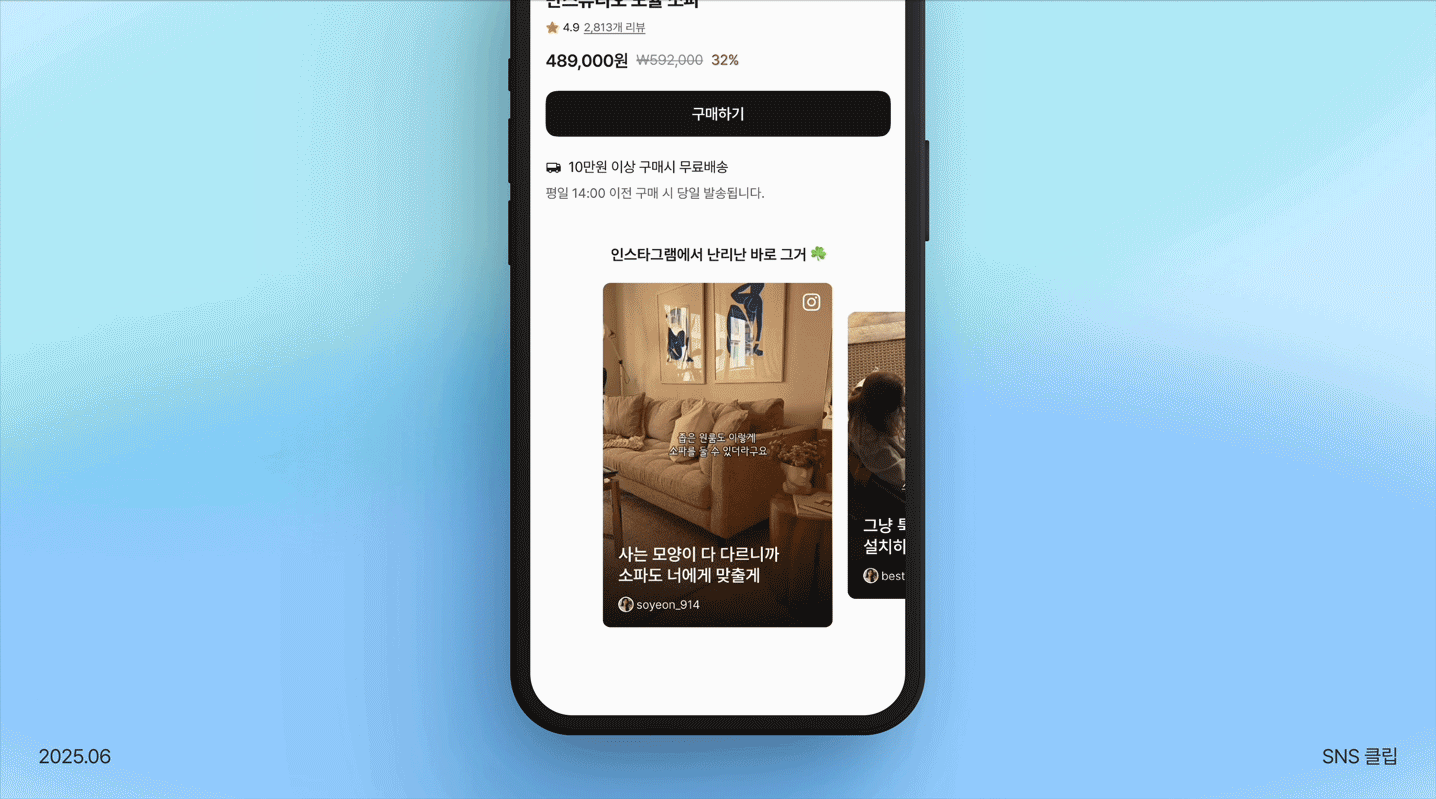 SNS 클립 위젯은 상품 상세 페이지 상단에 표시됩니다.